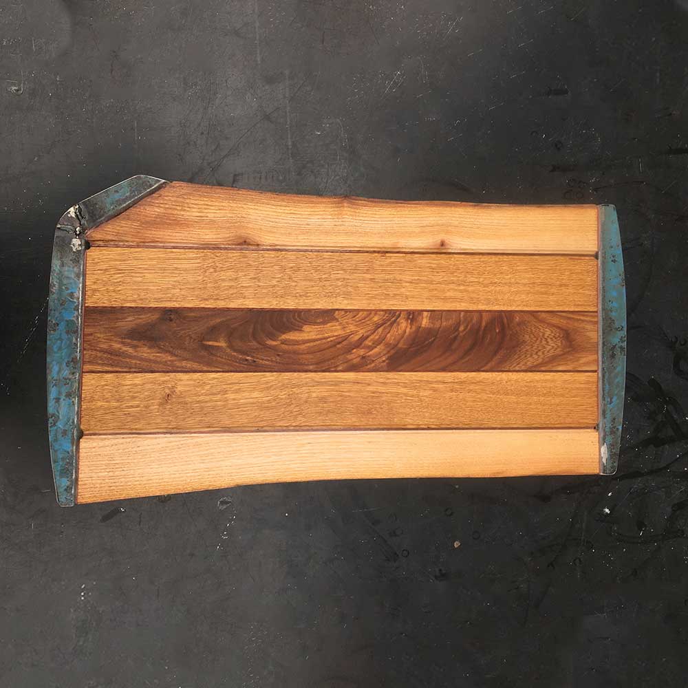 Yder rammen er i elm med barkkant og enderne er lavet ud af gamle pallereoler i jern, der giver et råt look, de er skåret i facon, slebet og lakeret med mat lak.